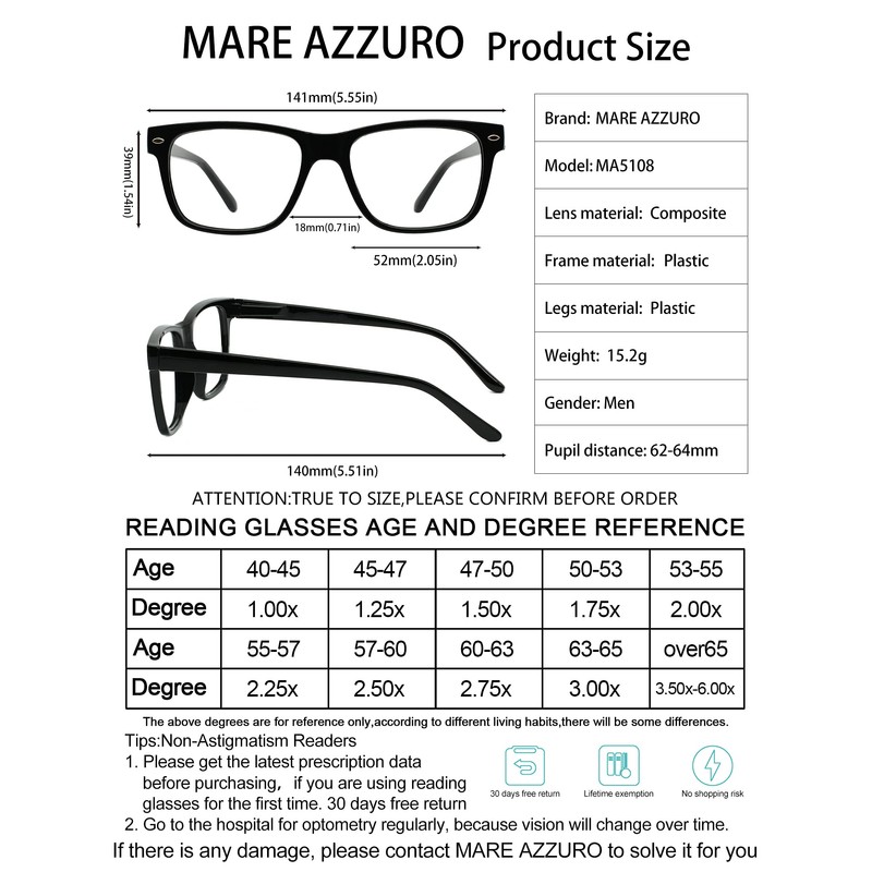 • WHY CHOOSE MARE AZZURO READERS: modern also focus on durable quality. We noticed the evaluations of "too heavy", "frame blocking the view" and "face clipped", so we designed this ultra-light big frame reader glasses with flexible spring hinge to give you a fashionable look and comfort.