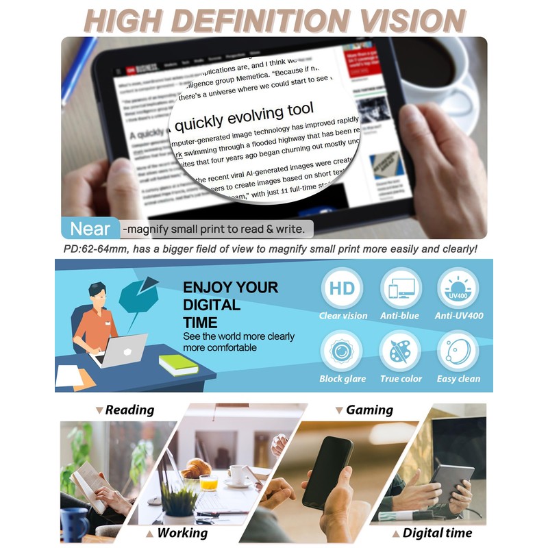 - 【HD Broader Vision】 the A-class computer readers 350 has higher definition magnifying glasses to read small print easily, best transmittance, reduce reflection & scratch resistant, easy to clean, true color, no blur and distortion, bigger field of view without turning your head to get a better clarity at home, office, party or in the car.