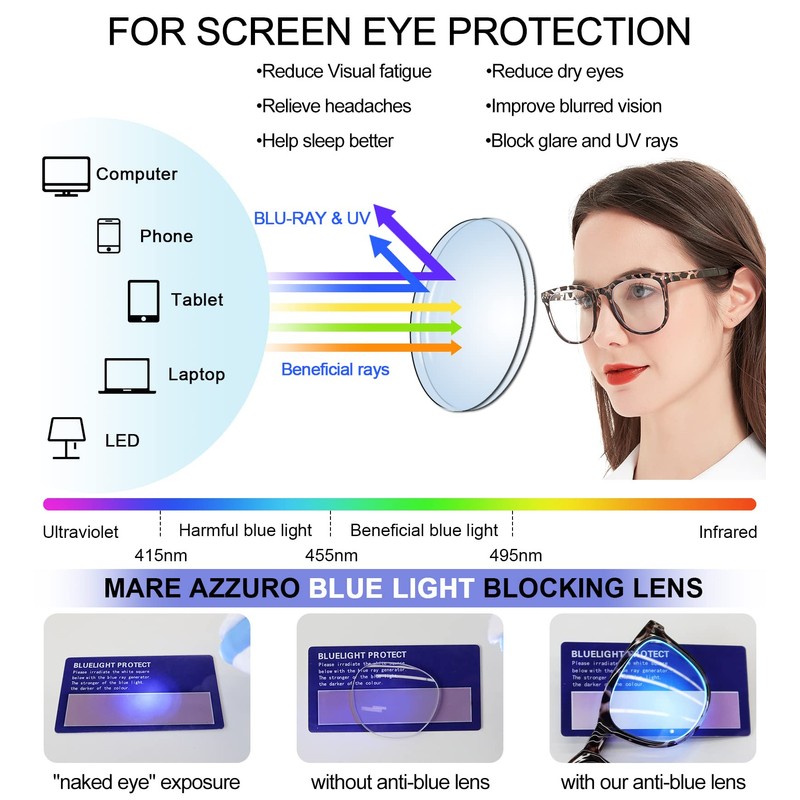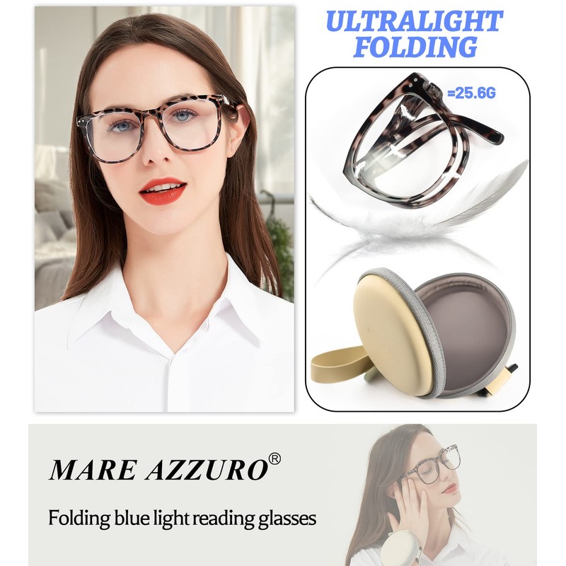 MARE AZZURO blue light blocking reading glasses for women is durable and flattering, more comfy and user-friendly. Superb spring hinges, one-piece nose pads, reducing the pressure on the nose.