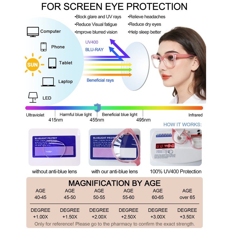 - Blue light reading glasses 1.25 with UV400 protection - effectively block blue ray from digital screens (computer, phone, pad, TV, LED, etc.) and UVA/UVB radiation from sunlight. Relieving your eyestrain & headache from long-term screen reading, working, watching video, gaming, or playing mobile to have a better sleep at night!