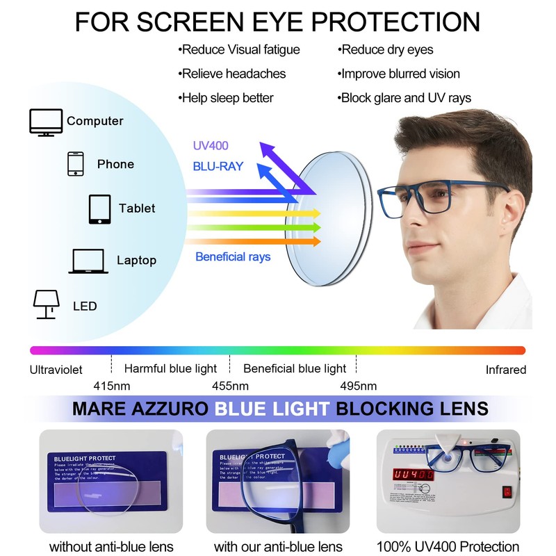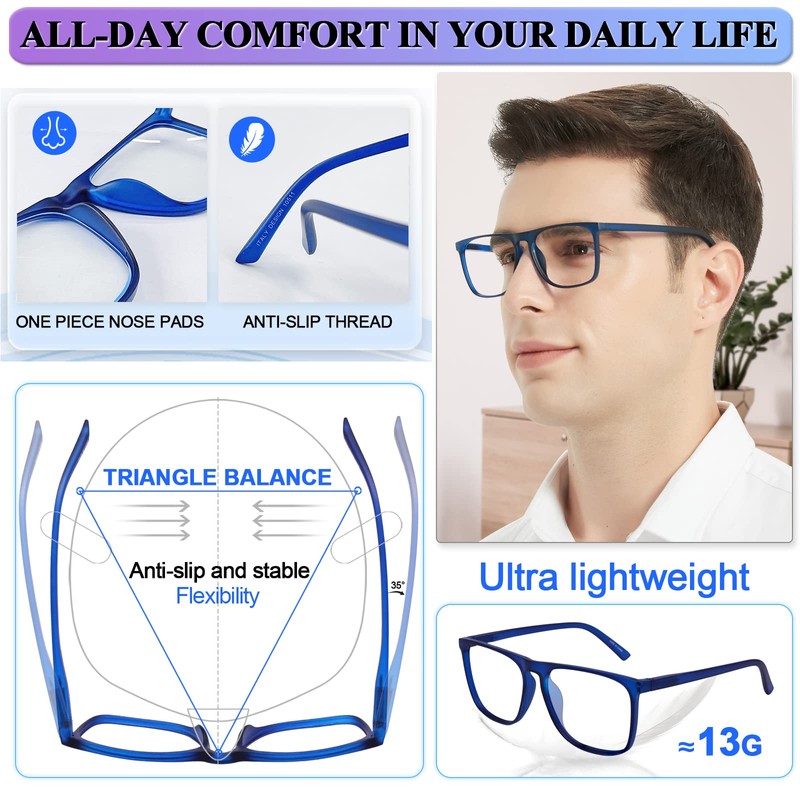 - Comfortable fit - the men’s blue light glasses is made lightweight frame with anti-blue light lens; with flexible spring hing won’t pinch your face, so great fit for bigger and wider face; extra large reading glasses give you a broad vision without turning your head. Ultra-light blue light readers make you all-day comfy while reading,web surfing, gaming and screen working.