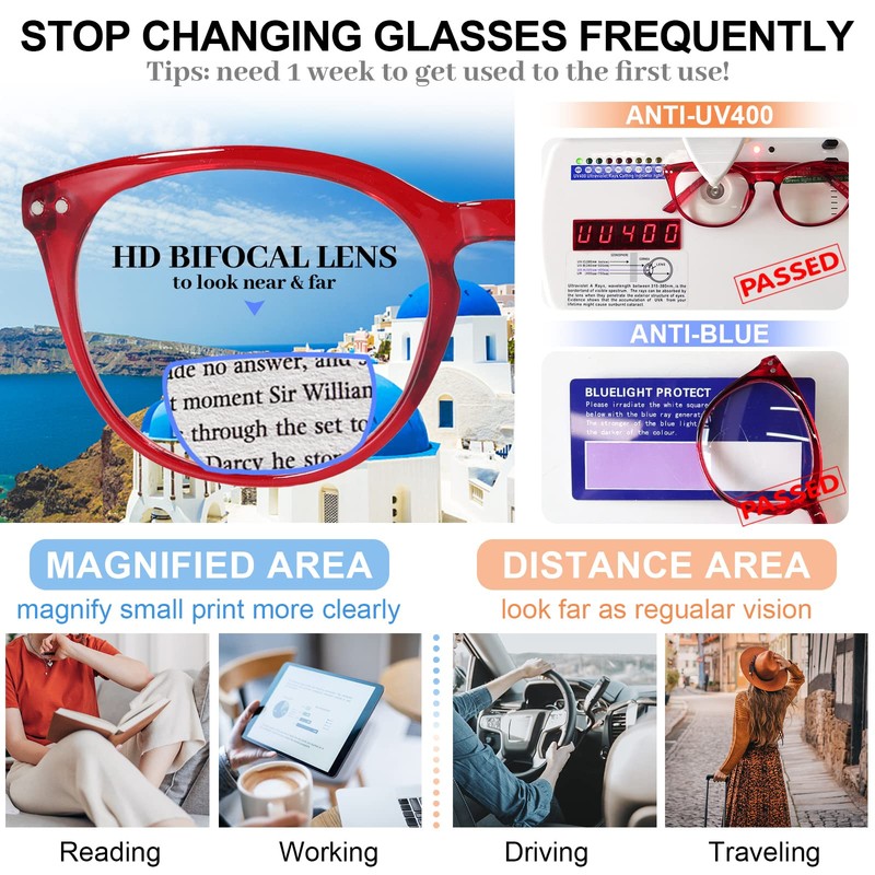 Multiple Color Options: Classic brown leopard tortoise blue light reading glasses for enjoying digital time at home, vintage blue bifocal reading glasses for computer working at the office, cute red bifocal readers for traveling to enjoy your life; modern clear frame readers with bifocals in the car for best driving. To match different outfit style in your daily life.