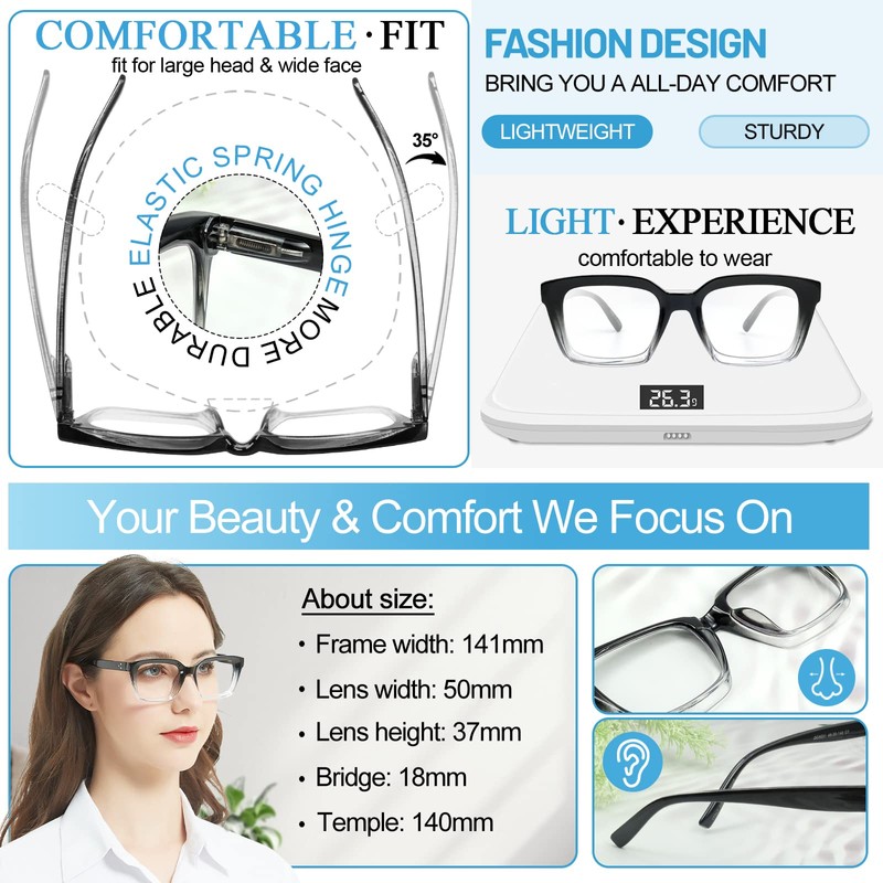 - Comfortable fit- with flexible spring hinge fits well for large head or wide face, durable and not easy to damage. Large square frame give you a broad vision without turning neck for a all-day comfort. Sturdy multifocal reading glasses are suitable for drivers, teachers, outdoor workers, etc. who need to work far and near.