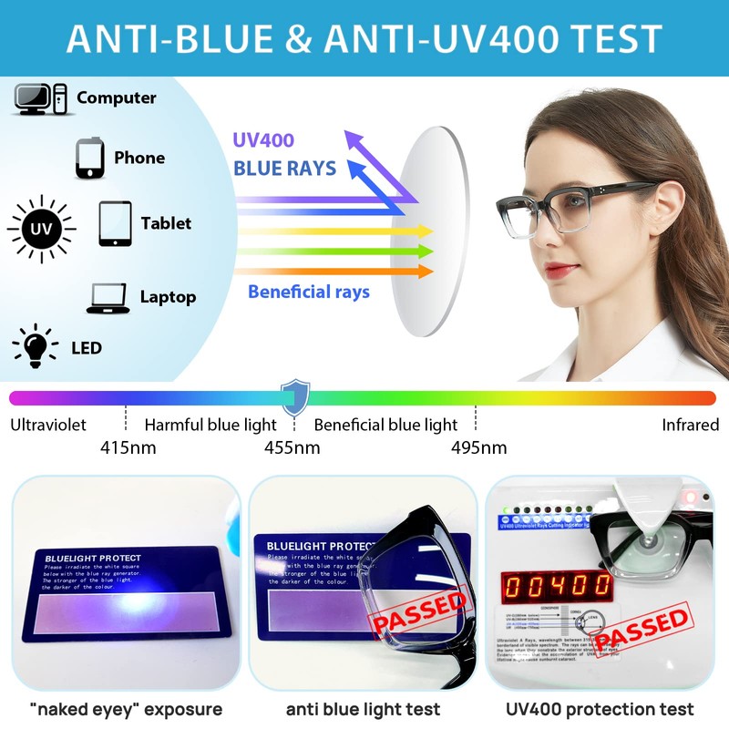 - Blue light blocking glasses 2.5 with UV400 protection - effectively cut blue ray from digital screens (computer, phone, pad, TV, LED, etc.) and UVA/UVB radiation from sunlight. Relieving your eyestrain & headache from long-term screen reading, working, watching video, gaming, or playing mobile to have a better sleep at night!