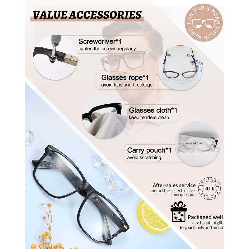 - 【MARE AZZURO TIPS】▶ reading area is smaller than ordinary full magnifying lens! Need 1 week to adapt it for the first time wearing! Non adhesive lenses, please do not worry about high temperature separation. About size - frame width:5.67in; lens width:2.20in; lens height:1.77in; bridge:0.63in; temple:5.59in.