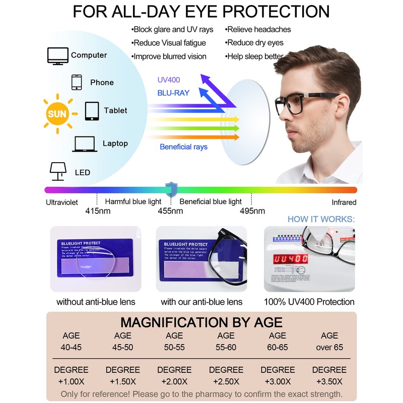 - 【ALL-DAY EYE PROTECTION】▶ blue light blocking reading glasses 225 with UV400 protection effectively cut blue ray from digital screens (computer, phone, pad, TV, LED, etc.) and UVA/UVB radiation from sunlight. Relieving your eyestrain & headache from long-term reading, working, watching video, gaming, or outdoor activities to sleep better at night!
