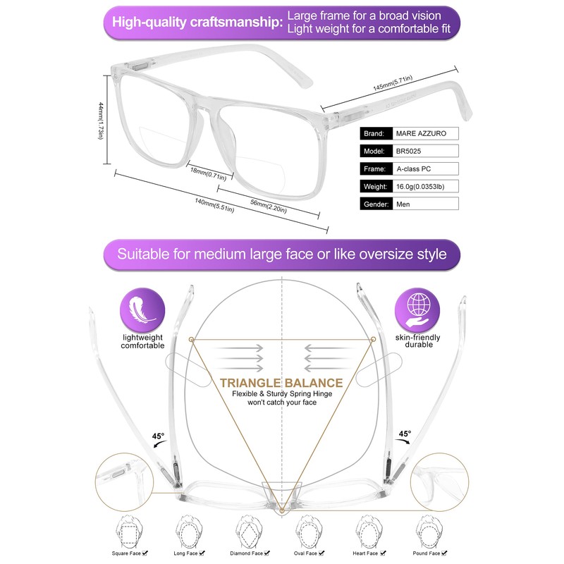 - Comfortable fit: With flexible spring hinge fits well for medium, big or even wide face, won’t pinch head. Lightweight and extra large square frame give you a broad vision without turning neck for a all-day comfort. Designer blue light glasses for male size: Lens Width: 56mm/2.20”, Bridge: 18mm/0.71”, Temple Length: 145mm/5.71”, Frame Width: 140mm/5.51”, Lens Height: 44mm/1.73”.