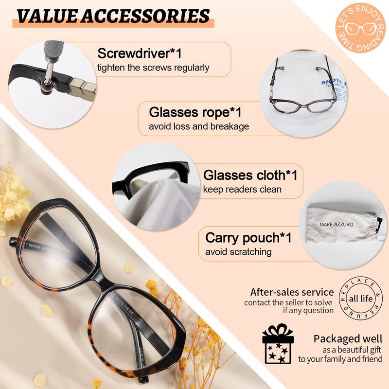 - Value accessories - 1.5 reading glasses ; A small screwdriver to tighten the screws regularly; A glasses rope to avoid loss and breakage; A portable carrying bag to store; A soft cloth to keep readers clean; as a perfect gift for family and friend!