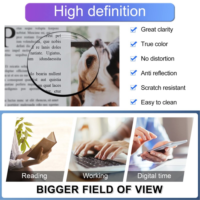 - High definition vision - A-class magnifying glasses for reading 150 has higher precision to read small print easily, good transmittance, reduce reflection & scratch resistant, easy to clean. Oversized large square reader glasses ensures true color, no blur and or distortion, bigger field of view without turning your neck to easily get a clear vision.