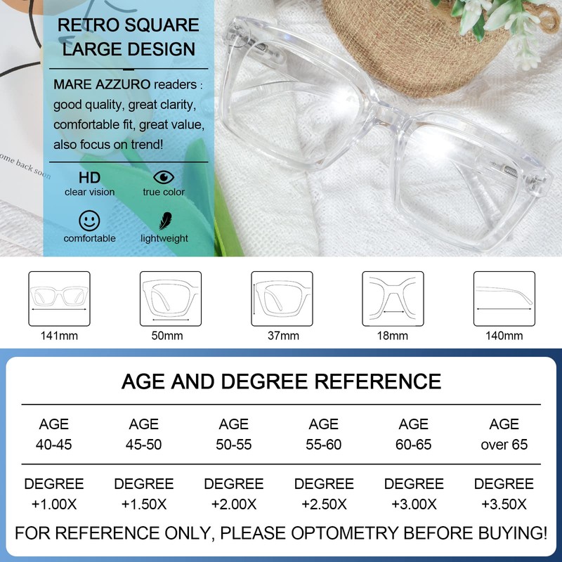 - High definition vision - A-class magnifying glasses for reading 150 has higher precision to read small print easily, good transmittance, reduce reflection & scratch resistant, easy to clean. Oversized large square reader glasses ensures true color, no blur and or distortion, bigger field of view without turning your neck to easily get a clear vision.