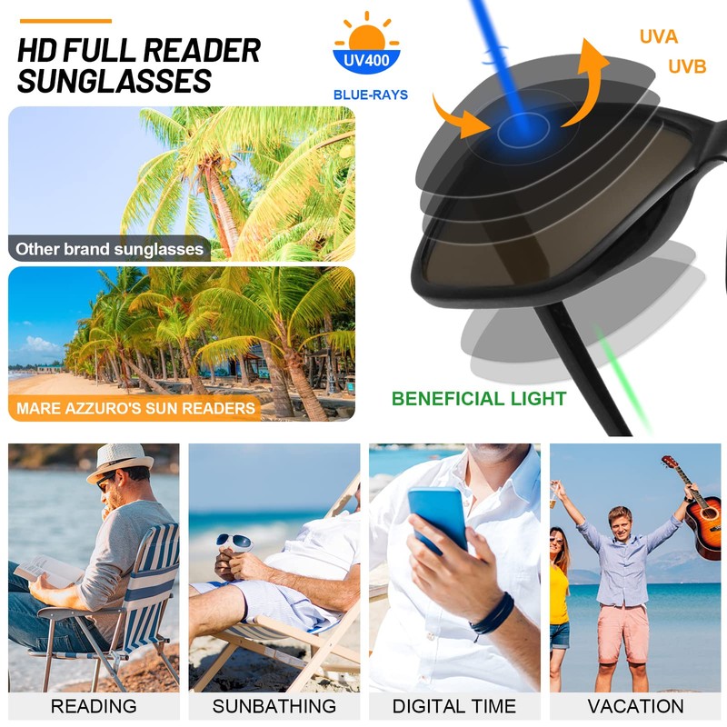 • Full reader sunglasses 3.0 for men - having the functions of sunglasses and reading glasses in one, filtering out sunlight reflected glare to protect your eyes from long-term UV damage by blocking harmful UV400, high light and blue light, perfect to read books /phone messages at the beach, swimming pools, gardens, etc.