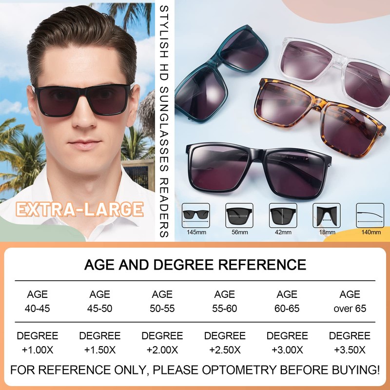 • Fashion design - The stylish extra-large readers sunglasses will make classy gentleman more attractive. 3 popular colors as a year-round fashion accessory for your business and casual outfit. MARE AZZURO reader sunglasses, has accurate 1.00 1.25 1.50 1.75 2.00 2.25 2.50 2.75 3.00 3.50 strength to meet your need. About size: frame width: 145mm; lens width: 56mm; lens height: 42mm; bridge:18mm; temple: 140mm.