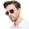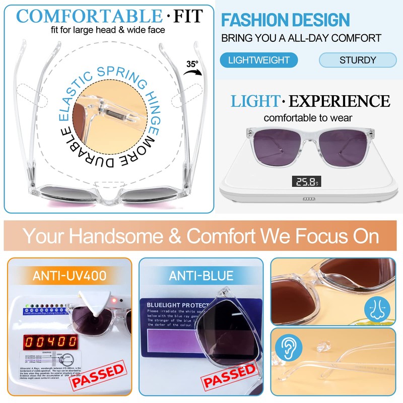 - Comfortable fit - designer outdoor sun reading glasses for men, big square frame adorn the stylish metal piece to make a fresh and handsome look. With flexible spring hinge fits well for large head or wide face, won't pinch head. Also lightweight shade with UV protection and blue light blocking dark lenses bring you a all-day comfort.