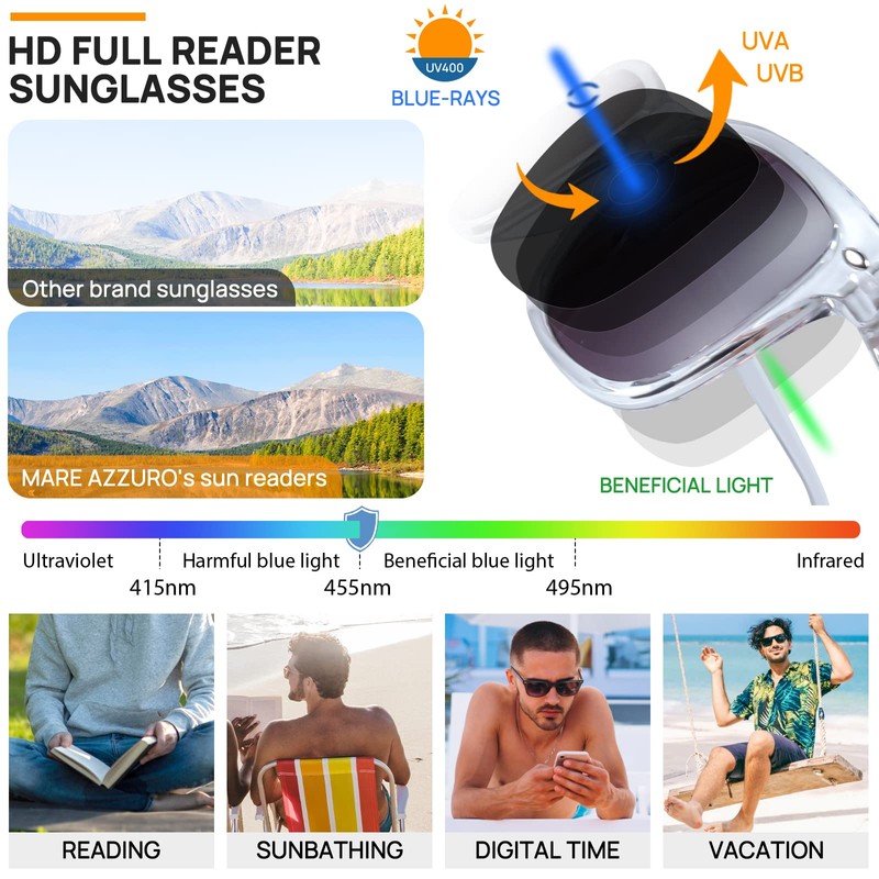 MARE AZZURO is committed to providing stylish, high-quality full reading sunglasses at reasonable prices. We are happy to strike a balance between quality, fashion and cost. In addition, make fashion within reach!
