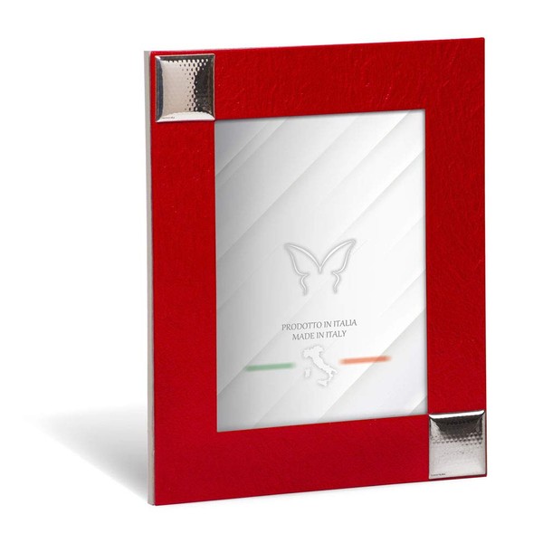 - Table photo frame 20 x 23.5 cm, suitable for horizontal and vertical positioning depending on the photo; the back of the photo is made of natural wood, while the frame is made of red crinkle faux leather; attaching two silver metal rivets