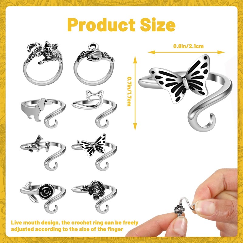 - Package Content: The 8-piece crochet ring contains foxes, dragons, butterflies, roses, snakes, cats, feathers and lotus flowers, which will inject infinite interest into your crocheting. Exquisite style is not only practical, but also your unique fashion accessories, which can add charm to you whether you wear crochet ring for finger everyday or attend special occasions