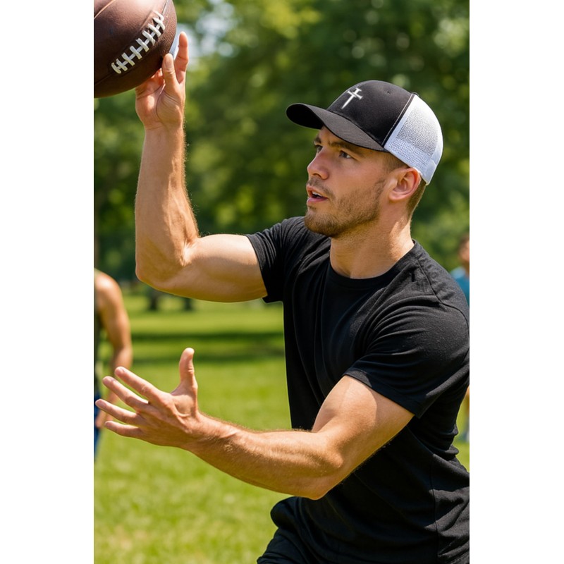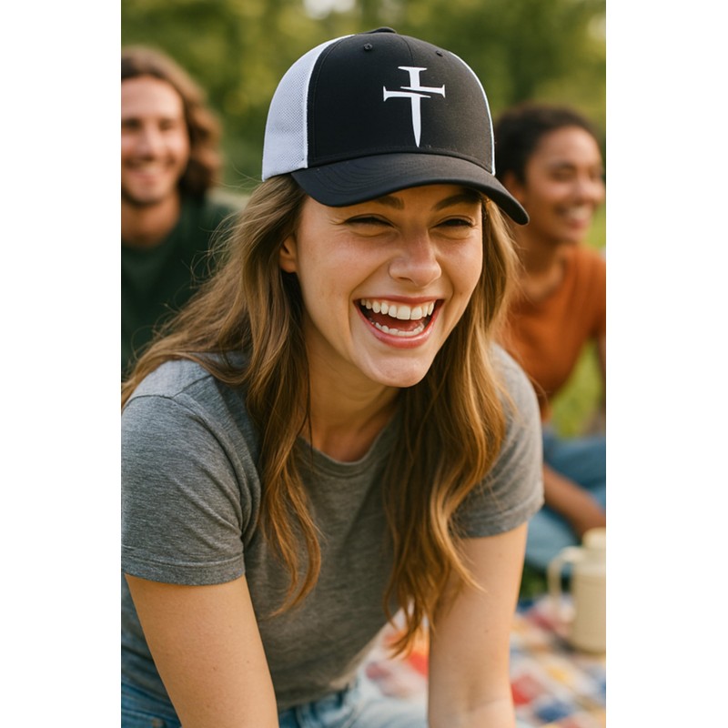 Mari Kyrios Christian Hat 3 Nail Cross Heart Side Heat Pressed Black on White Curved Bill - Mesh Trucker Snapback Cap