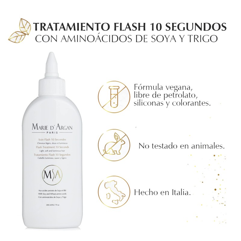 Marie d'Argan Tratamiento Profesional Flash 10 Segundos Cabello ultra luminoso, suave y ligero 200 ml avanzada tecnología se activa instantáneamente al contacto con el agua con Aminoácidos de Soya y Trigo