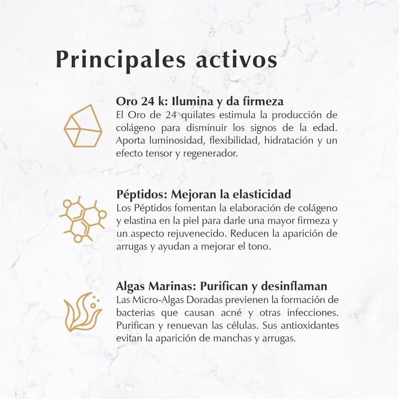 - Oro 24K Infundido para Rejuvenecimiento: Enriquecido con partículas de oro 24K, este trío hidratante promueve la regeneración celular y estimula la luminosidad de la piel para un cutis rejuvenecido y radiante.