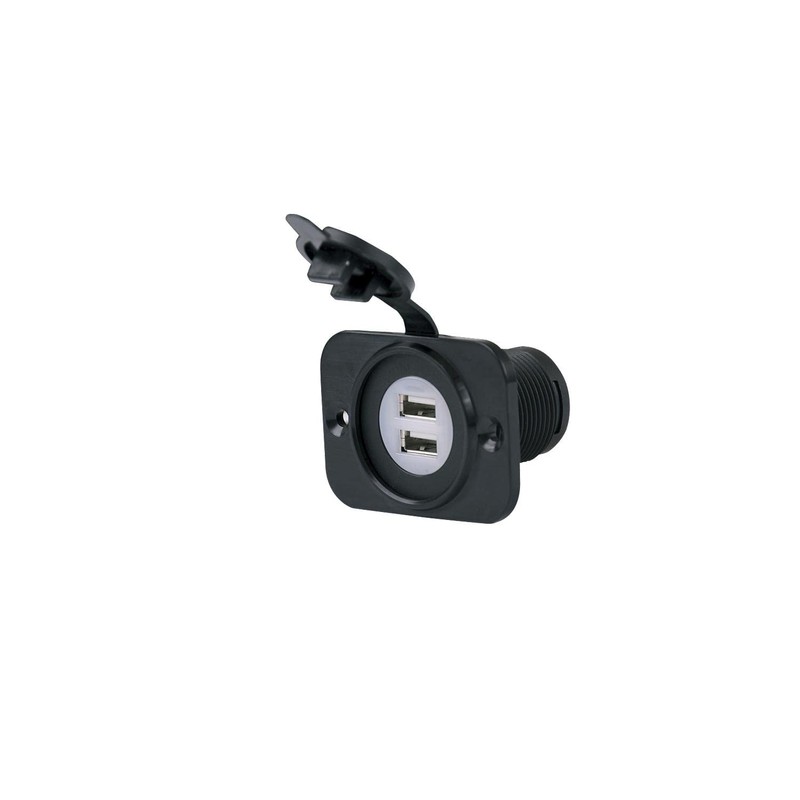 - Black 12V dual USB charger receptacle with insulated terminals