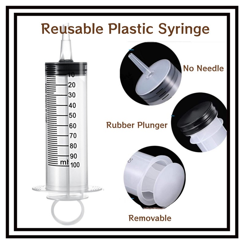 - [Package Includes] You will get 2pcs 100ml syringes, 1pc 20ml syringe, 1pc 60ml syringe, 2 connectors, 3pcs 1m tube and 1 sponge bottle brush.