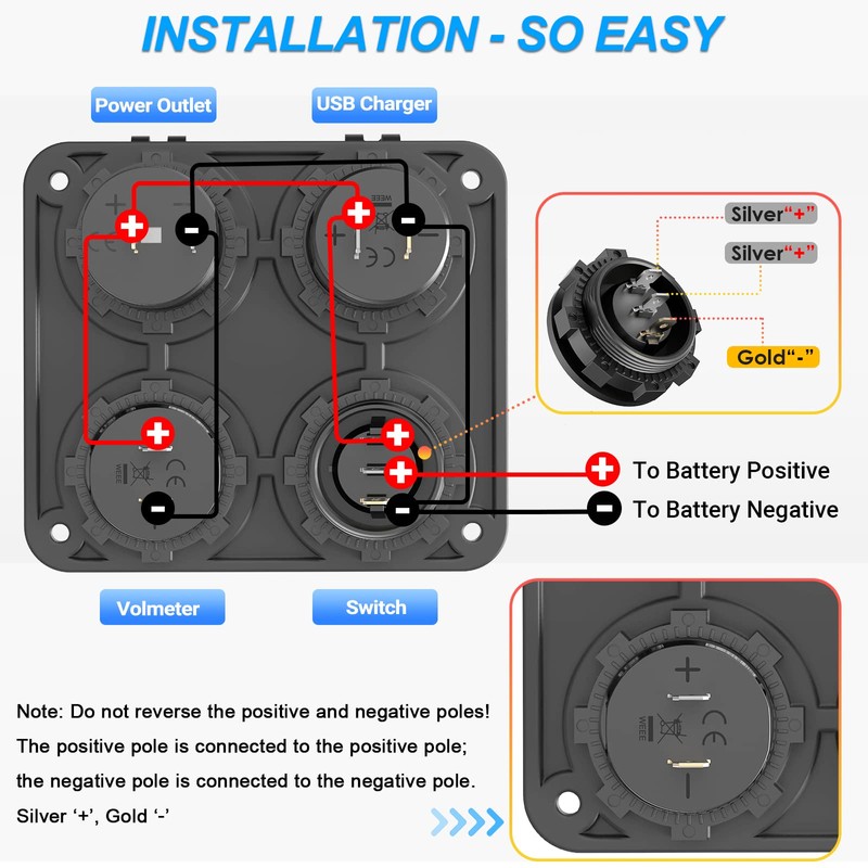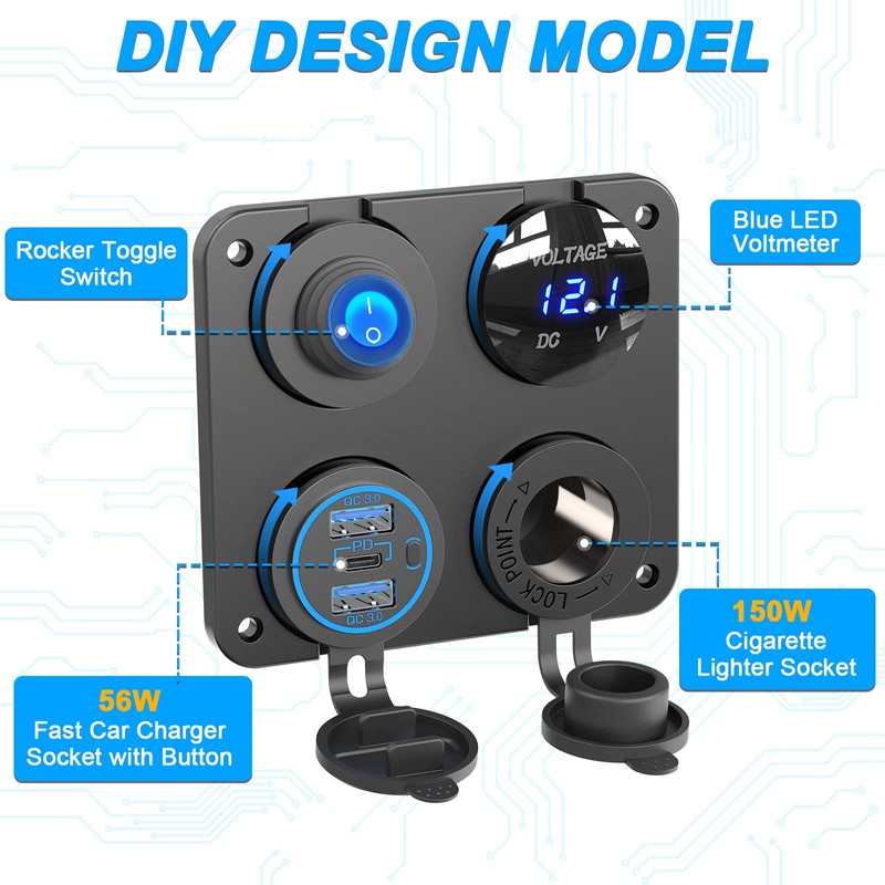 【4 in 1 12V Charger Socket Panel】OUFFUN 12V charger socket panel has everything you need - an improved 12V usb socket (total 56W, with ON/OFF button), a strong cigarette lighter socket (150W), a LED digital voltmeter, and a toggle switch. It's a compact 4-in-1 design that saves space and can fulfill all your charging needs. Plus, you can swap out the charger sockets with other ones you have easily because they are freely interchangeable.
