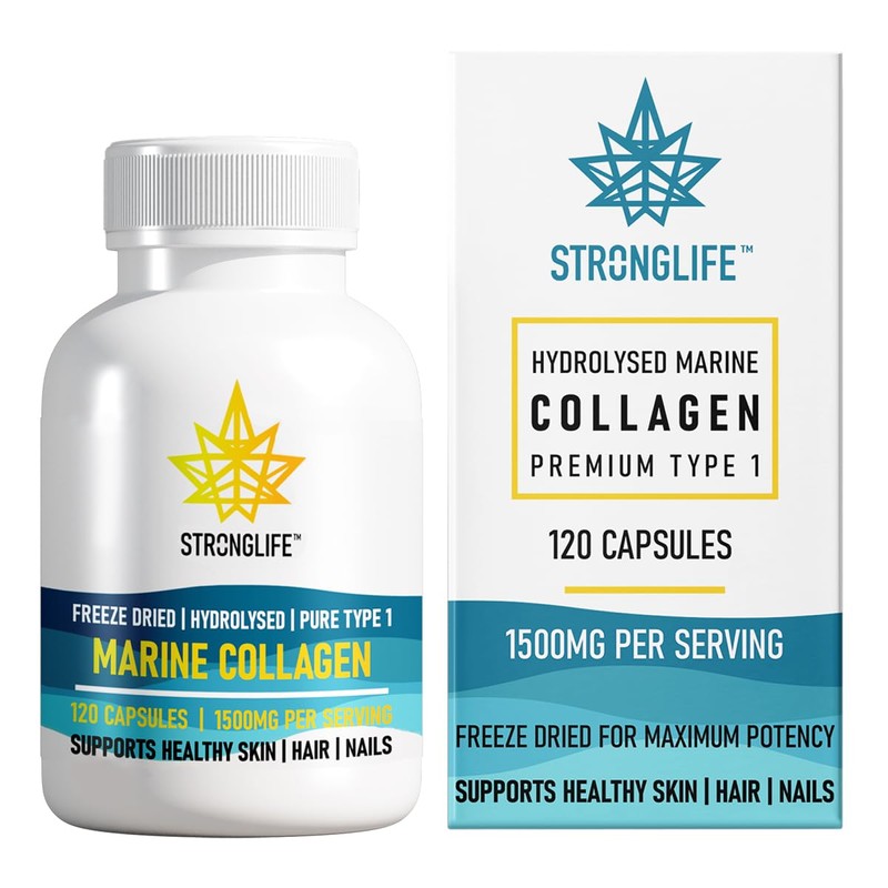 - Stronglife Marine Collagen Hydrolysed Peptides Capsules: Collagen is crucial for maintaining the structure of skin, joints, bones, teeth, and muscles. With aging, our natural production decreases. StrongLife Marine Collagen Capsules offers high-quality 120 hydrolysed Peptide Type 1 collagen capsules from Wild Caught fish, offering a powerful boost to your beauty and health regimen. Convenient alternative to collagen powder, providing the essential support your body needs.