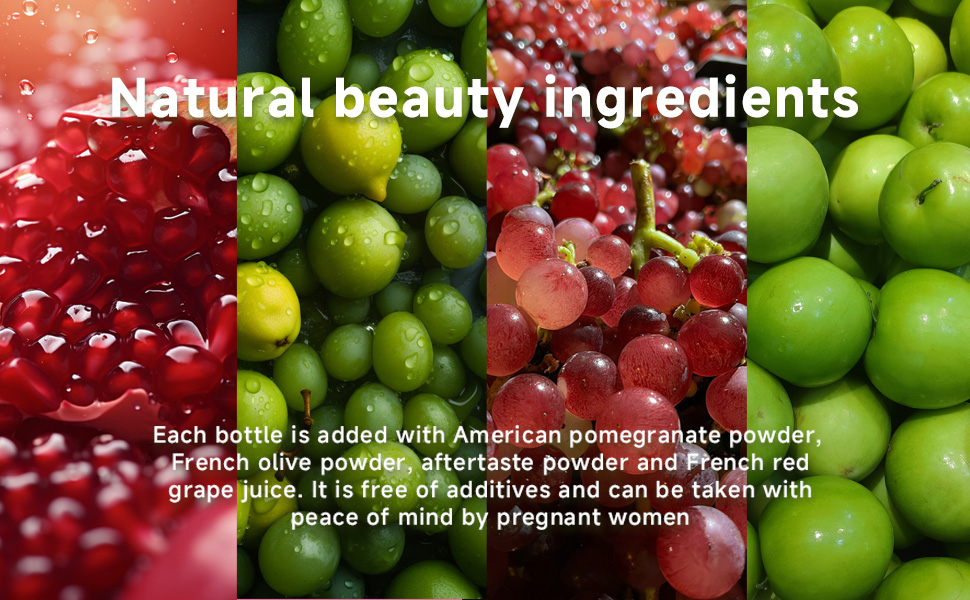 - 6 Core Ingredients: 1. Sleep - aiding: 20mg of Korean - patented 纬 - aminobutyric acid, which can help with sleep and relaxation*; 2. Whitening: American pomegranate powder*; 3. Anti - glycation: French olive fruit powder*; 4. Antioxidant: Phyllanthus emblica powder, French red grape juice (rich in VC); 5. Hydrating: Chitosan; 6. 0 Additives, Safe and Burden - free, suitable for pregnant women, breastfeeding mothers and during menstruation*. 0 added hormones, 0 added sucrose, 0 fat. Extremely low in calories, about 33 calories per bottle = 1 strawberry, 1 - 2 bottles per day.