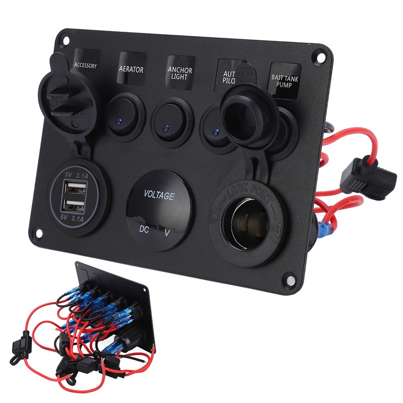 1、High Efficiency Protection: 5 LED toggle switches with overload, over current and short circuit protection for protection at any time. 2、Multi Function: Protecting the panel from overheating, overcurrent, overcharging and short circuit. 3、Easily Replace: Simple installation and use, no complicated procedures, easy replacement. 4、Features: The input voltage of the voltmeter is 12‑24V, the output voltage is 5V, and the output current is 2.1A. 5、Wide Application: Can be installed in 12V and 24V vehicles, yachts, ships, caravans, trucks, etc.