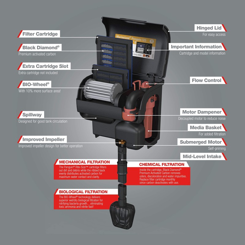 Marine Land products are designed with both performance and style in mind. We push precision and power Beyond the expected and listened to our loyal customers to make our products even better. We do this because at the heart of our innovative spirit is a desire to help hobbyists everywhere do more, Create more and, most of all, enjoy more. So whatever you’re passionate about – freshwater or saltwater, Big or small, beauty or science – make your aquarium your own. Marine Land Penguin Pro 125 power filter delivers easy, three-stage mechanical, chemical and biological aquarium filtration. This ultra-quiet filter has a decoupled motor to reduce noise so you can relax and enjoy your aquarium. This power filter contains bio-wheel technology to provide wet/dry biological filtration for nitrifying bacteria growth and eliminating toxic ammonia and nitrate fast. Uses Marine Land rite-size B filter cartridge. Filters your 20-gallon aquarium six times per hour with flow control up to 125 GPH. Available in six sizes: 100 (for up to 10 gallons), 125 (for up to 20 gallons), 175 (for up to 30 gallons), 275 (for up to 50 gallons), 375 (for up to 75 gallons), 450 (for up to 90 gallons).