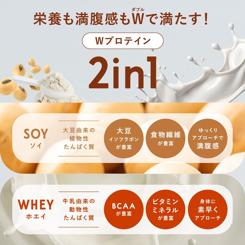 • 【ホエイとソイのダブルプロテイン】運動後のタンパク質の補給がスムーズにできるホエイプロテインと、消化吸収がゆっくりで満腹感を持続しやすいソイプロテインを配合。