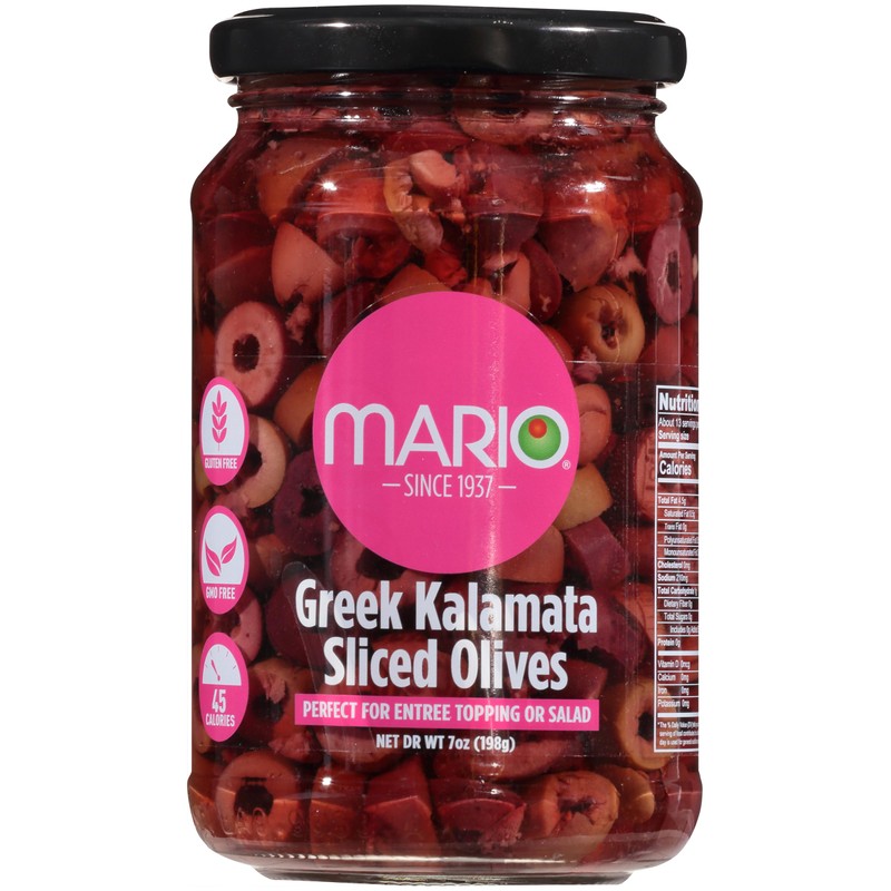 Mario sliced kalamata Mediterranean olives. Mario Camacho foods is an industry