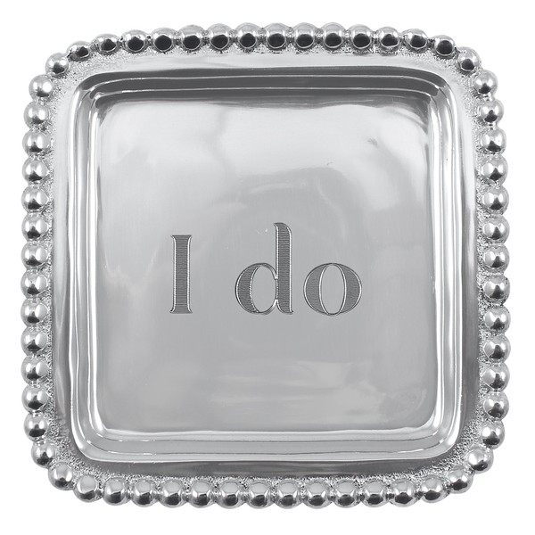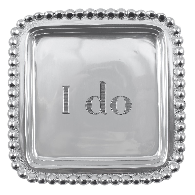 Say "I do" to this elegant beaded square tray. Perfectly sized to hold rings on a Dresser or post-it notes on a Desktop. Handcrafted from 100% recycled aluminum with a beaded edge and engraved with a whimsical script font.