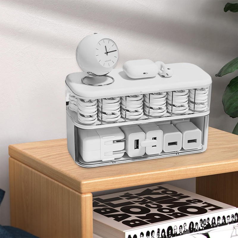 Marjoramy Double Layer Cable Storage Box, Transparent Cable Organiser Box with 6 Compartments, Double Opening Cable Organiser for Desk Storage, Office, Home Use (White)