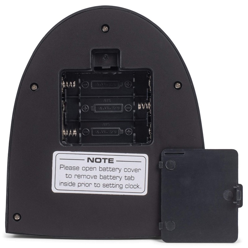 - Clock is made of acrylic and iron metal with midnight black finish; Requires 3 AA batteries (not included); Before setting the alarm, you better fasten your seat belt in anticipation of a 8000 horsepower engine screaming into action waking you from a deep slumber