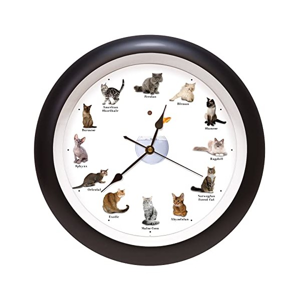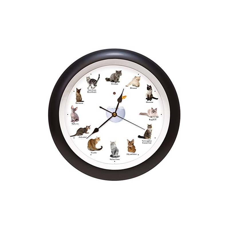 Mark Feldstein & Associates Meowing Cat Sounds Wall Clock, 13", Black, 12 Popular Breeds