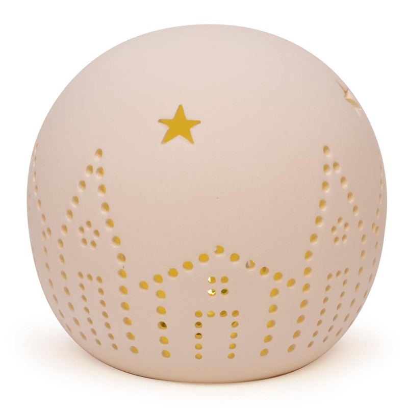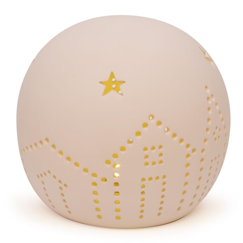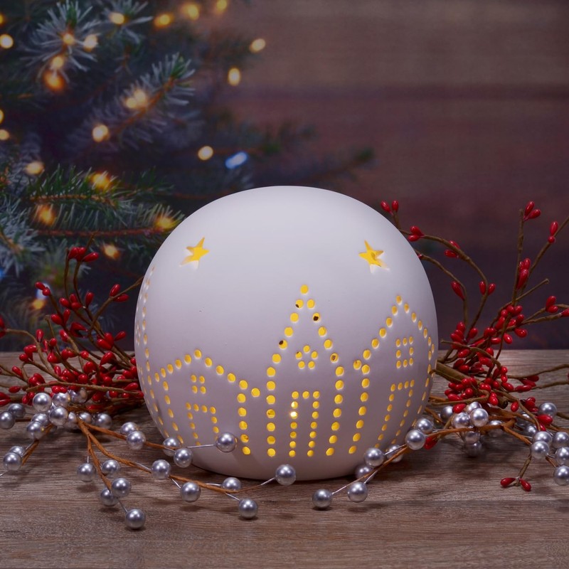 Mark Feldstein & Associates Perforated Village Houses and Stars Unglazed Porcelain 6 Inch LED Light Up Globe Tabletop Decoration