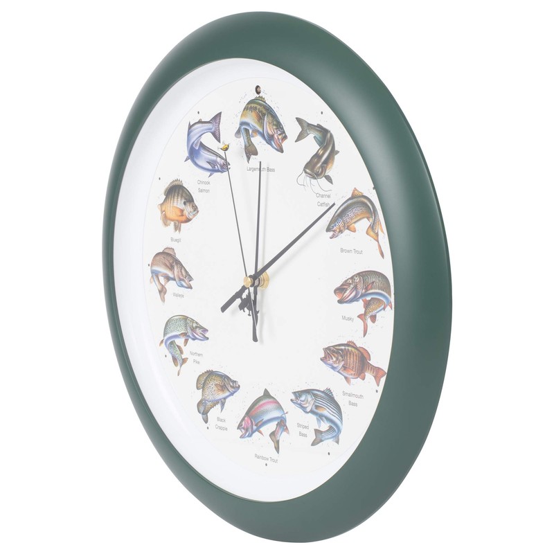 - Clock is made of acrylic with hunter green finish; Requires 3 AA batteries (not included); Each hour is announced by a variey of action fishing sounds