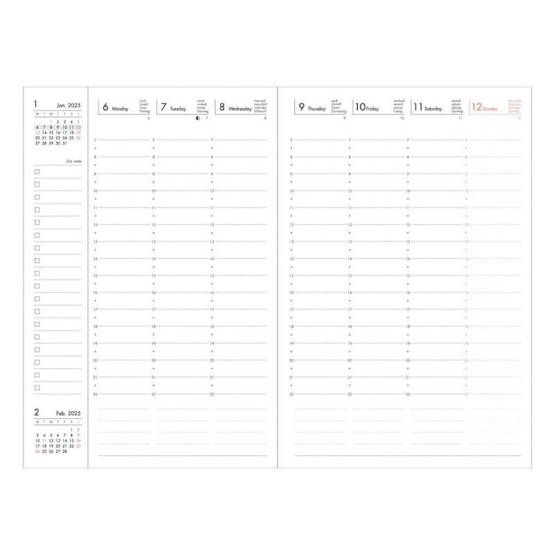 - The time division is done on a double page for planning per week and a monthly overview