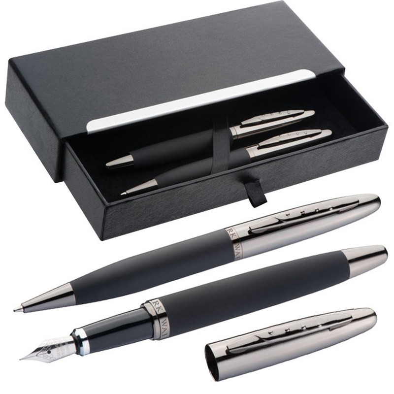 - Mark Twain Writing set in black, slide-on case with blue writing twist ballpoint pen and fountain pen with rubberised barrel.