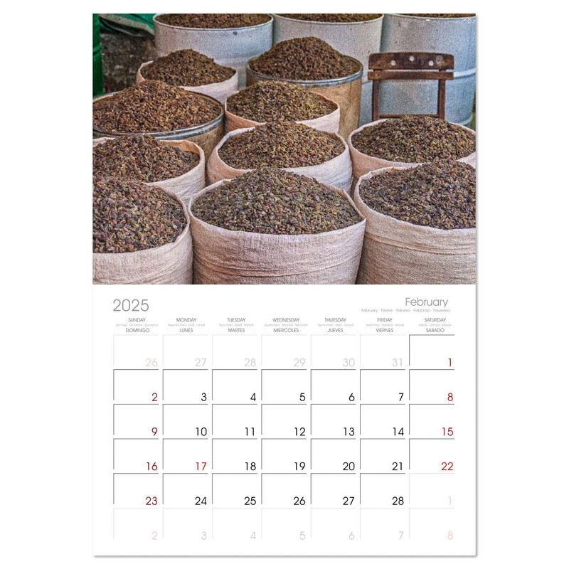 - DESIGN - 12 unique pictures, large monthly grid for planning with dates in 5 languages, including Spanish and French. 14 Month Calendar (Jan 2025 - Feb 2026).