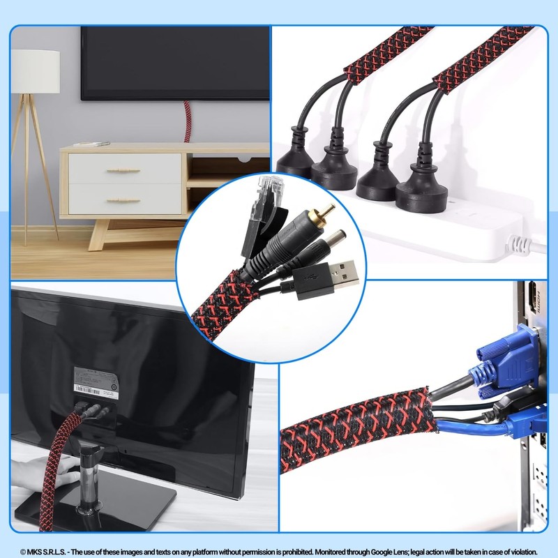 - Self-closing braided cable hose: ideal for home and professional use, perfect for hiding cables for TV, PC, consoles and hi-fi systems. Side open, closes automatically and expands to twice the nominal diameter. Available in diameters from 3mm to 32mm and lengths from 4m to 8m Made from PET HB 94 Polyester. Colours Available: ⚫ Black/ White / Black / Blue / Black / Red