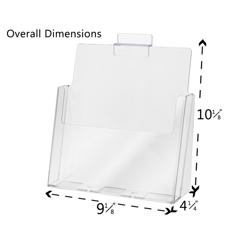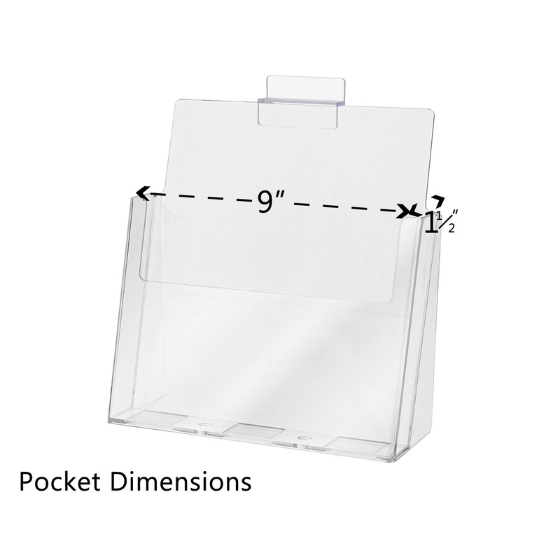 - Holds 8.5"W literature. Pocket Dimensions: 8.75"W x 1.5"D. Overall Dimensions: 9"W x 4.25"D x 10"H *All sizes are approximate