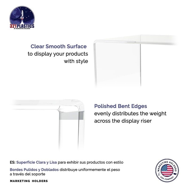 - Looking for a durable and elegant means to display your prized merchandise? Our acrylic U-Shaped Risers are effective at displaying and showcasing products to create eye-catching displays your customers can’t resist! These acrylic display risers create a sturdy platform to showcase a variety of products and merchandise. Our clear acrylic pedestal risers are the perfect solution for making merchandise appear as if it were floating. These modern lucite stands are ideal for indoor or outdoor use.
