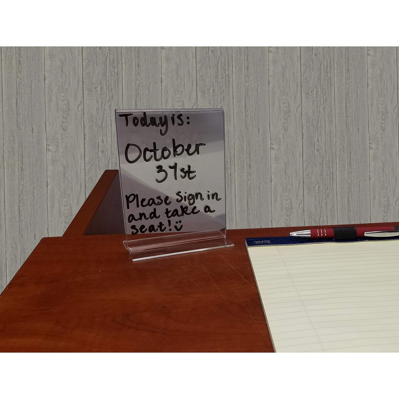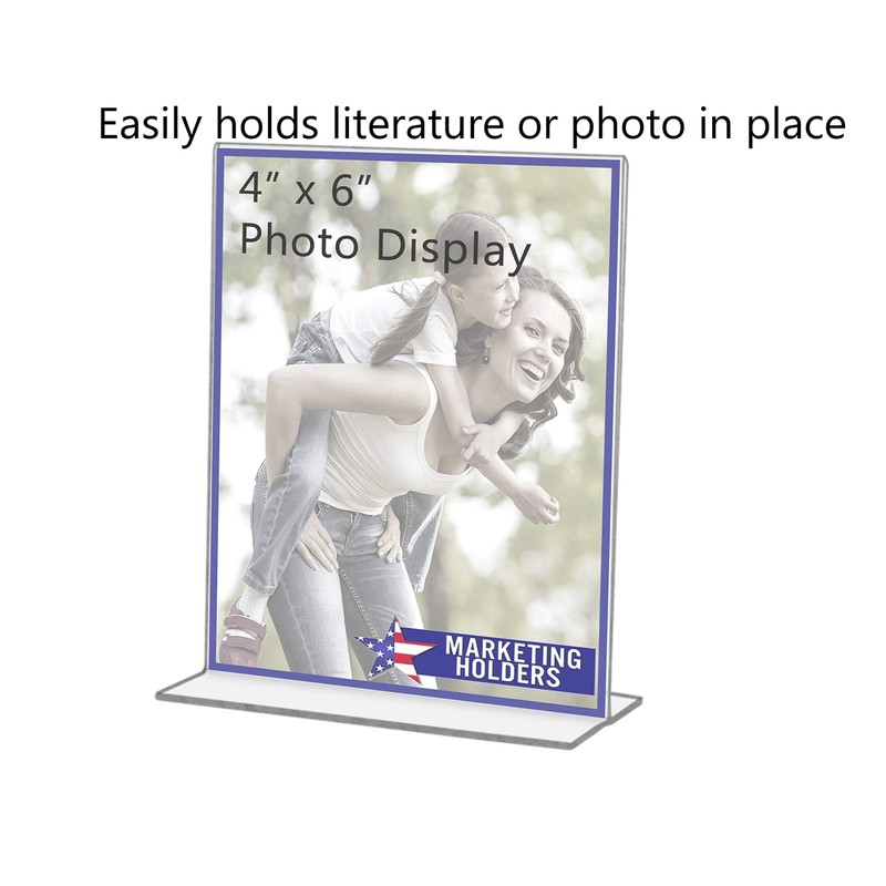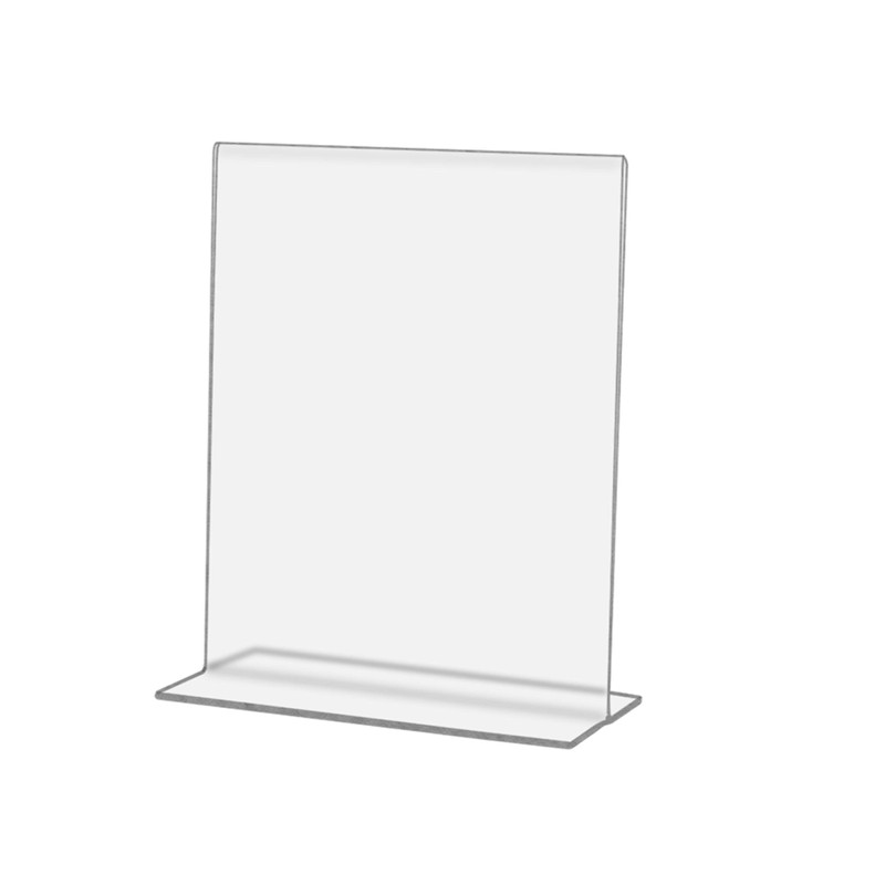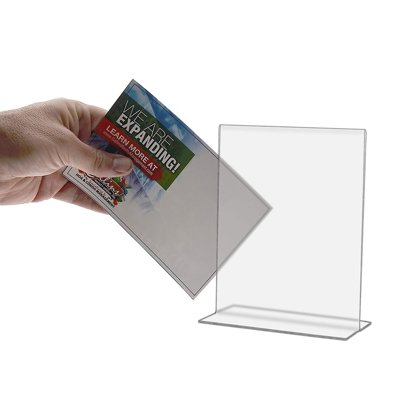 This versatile table sign holder can be used as a single or double-sided display and is perfect for table menus, point-of-purchase signs, pricing, product details, or general information and accommodates 4”W x 6”H printed material. Made of durable clear acrylic, the sign holder presents a clear view of signage while the t-shaped base provides stability and bottom-loading access for quick and easy sign change-out. Freestanding and portable, place the tabletop sign holder on virtually any flat surface in business lobbies, restaurants, hotels, tradeshow booths and more.