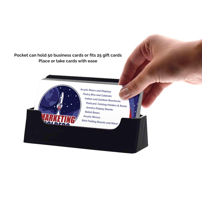 - This black freestanding business card holder is designed to hold and display business cards, gift cards, appointment cards or any other 3.5”W x 2”H printed material. Made of durable plastic acrylic, the card holder can be conveniently placed on desks, tables, retail counters or anywhere you want to leave your cards for customers to take one.