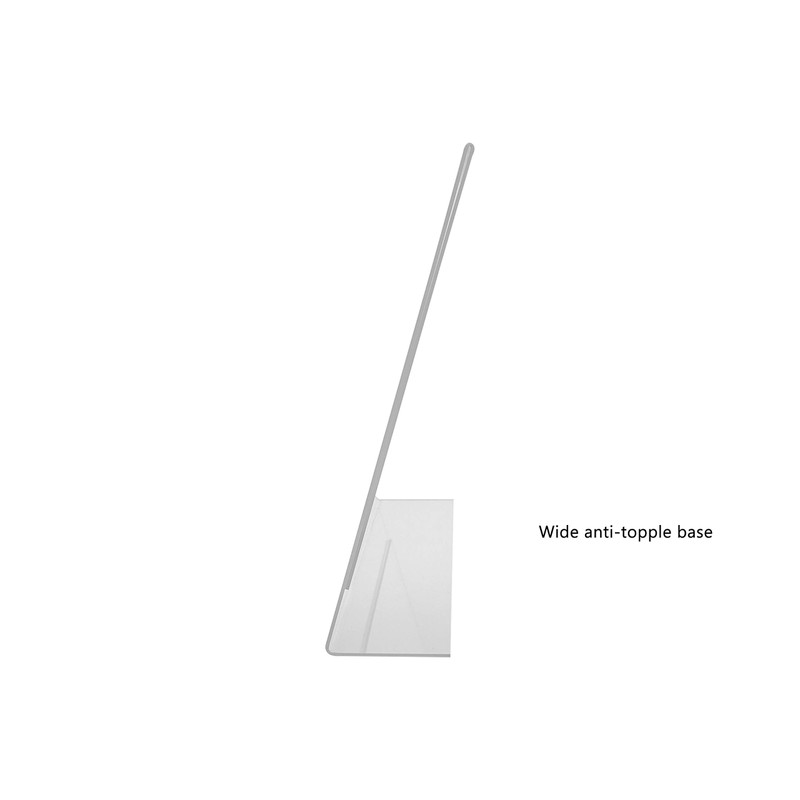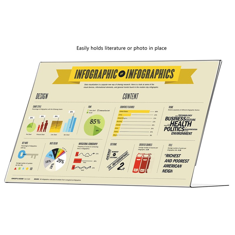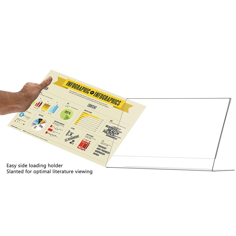 - Perfect display solution for business posters, POP signs, advertisements, product information, office hours, pricing, graphic poster, and more. Display on desks, tables, and counters in restaurants, bars, retail stores, trade show booths, hotels and other business locations. Angled, slant back horizontal design provides stability and optimal view of signage. Side loading design allows display material to be easily inserted and removed.