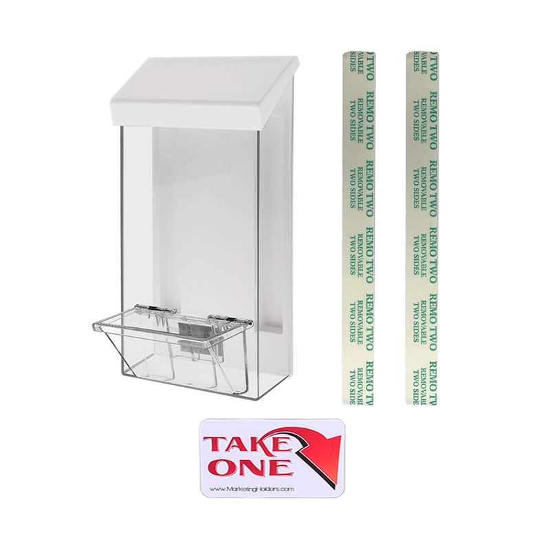 - Includes: Brochure holder with white lid, 2 strips of peel and stick adhesive and one "Take One" sticker Proudly made with premium high quality acrylic Simply mount your outdoor brochure box outside your brick and mortar business. These are perfect for menus in front of restaurants. Many other businesses keep their maps or business information pamphlets on the wall inside or outside their front door. This take one holder is super durable and has a clear front to show your literature.