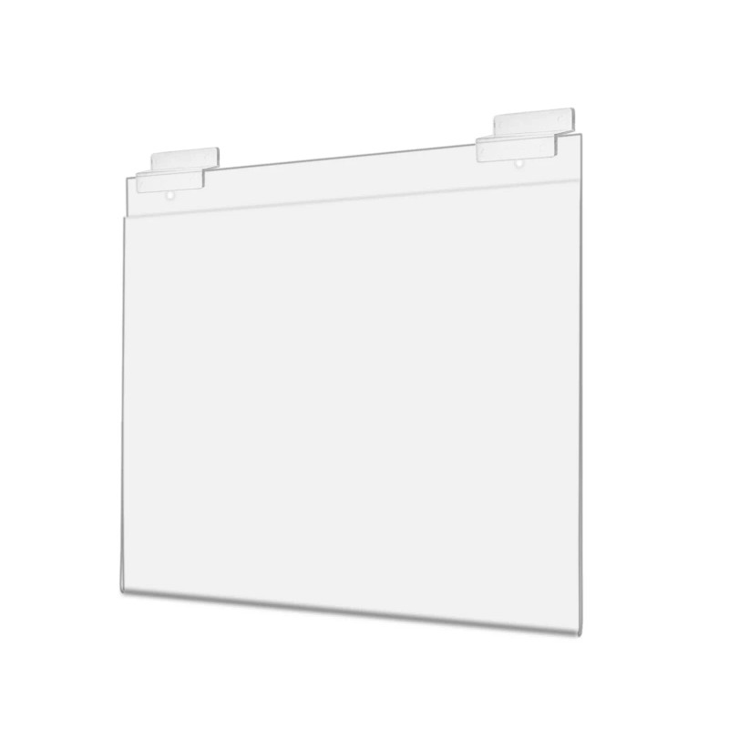 This versatile 14"w x 11"h slat wall acrylic sign holder is perfect to display single notice, signage, photographs, product information, flyer, graphic poster and more. Made of durable clear acrylic, the holder is open on both sides allowing display material to be easily inserted while the angled, slant back design offers optimal view of signage. Additionally, the top loading design allows for quick and easy sign updates.