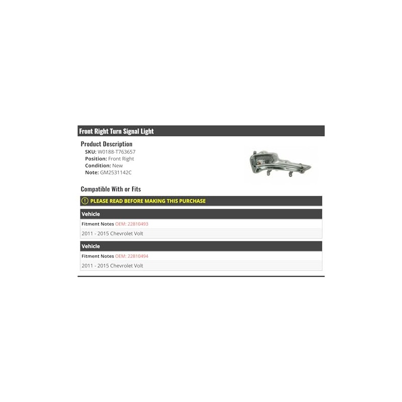 Marketplace Auto Parts Front Right Passenger Side Turn Signal Light - Compatible with 2011-2015 Chevy Volt